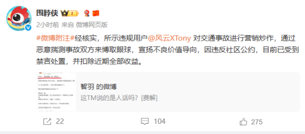 10月9日,微博社区观察员官方账号@围脖侠 发布消息称,用户@风云XTony 对交通事故进行营销炒作,通过恶意揣测事故双方来博取眼球,宣扬不良价值导向,违反社区公约,目前已受到禁言处置,并扣除近期全部收益。