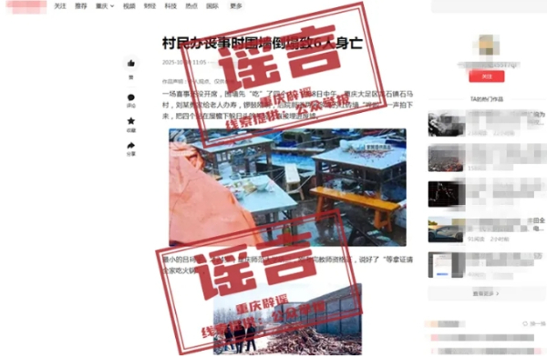 近日,有网民在互联网平台发布信息称“9月8日,重庆大足区龙石镇石马村,围墙倒塌致6人身亡”,引发关注。经核实,网传信息系谣言。