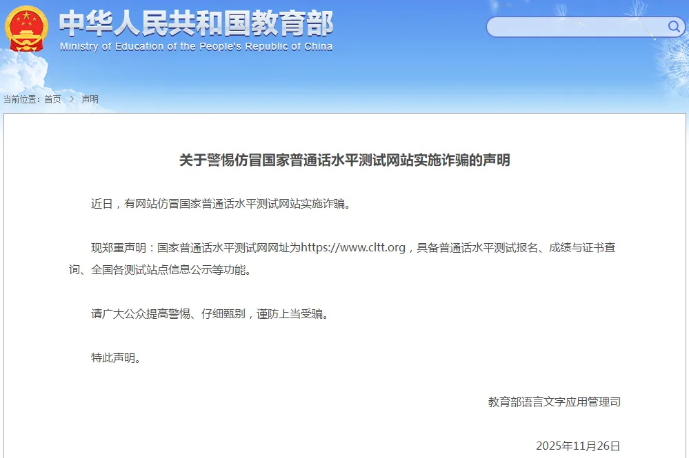 11月26日,教育部语言文字应用管理司发布《关于警惕仿冒国家普通话水平测试网站实施诈骗的声明》: