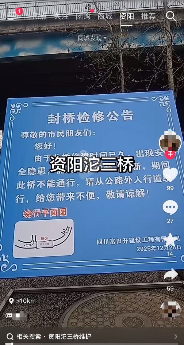上述网友拍摄视频中,有一则封桥检修公告,其内容称“由于此桥修建时间已久,出现安全隐患,需要封桥检修、翻新”。此外,该网友还配发有文字“资阳沱三桥”。