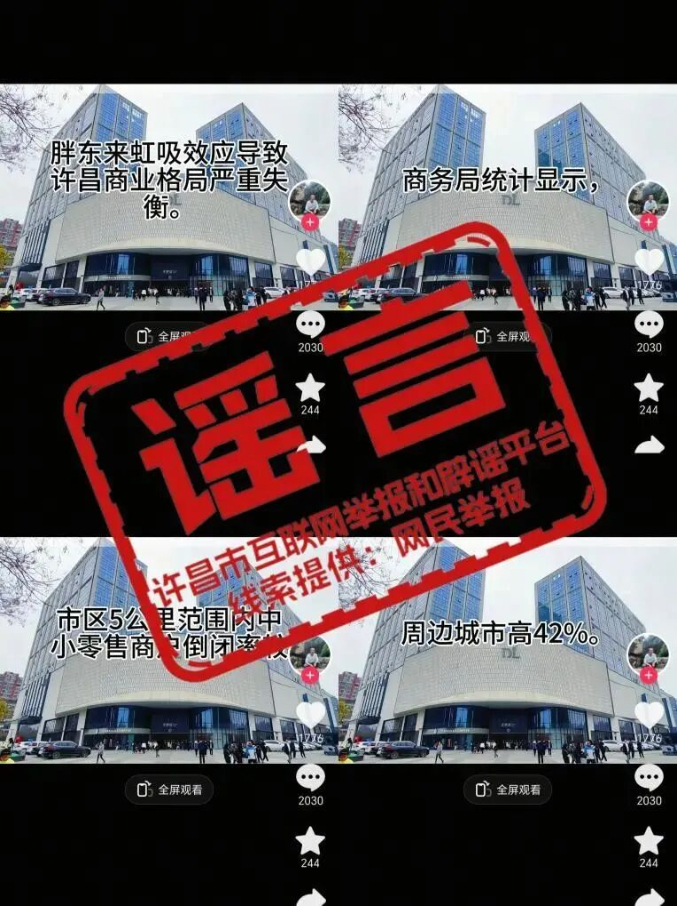 针对网传“胖东来虹吸效应导致许昌商业格局严重失衡”的谣言,许昌市委网信办核查为不实信息后,及时进行辟谣,还原事实真相。公安机关已对违法违规账号主办者进行训诫,当事人主动删除相关不实信息。