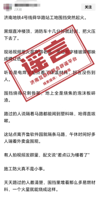网传“济南地铁4号线舜华路站工地围挡突然起火”,假的!