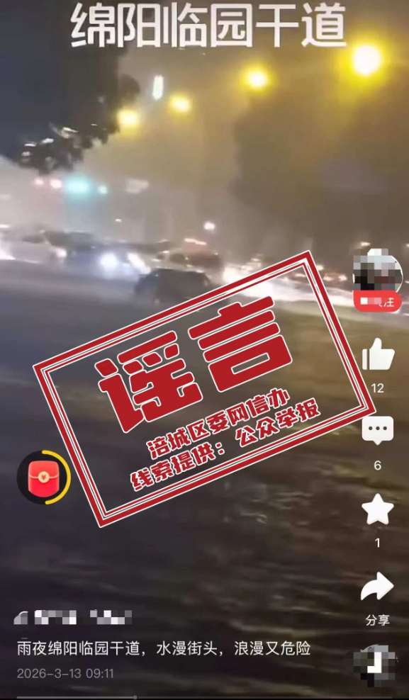 近日,有网传视频称“雨夜绵阳临园干道水漫街头”,相关内容引发部分市民关注。经核实,该信息为不实信息,特此辟谣,澄清事实,避免误导公众。