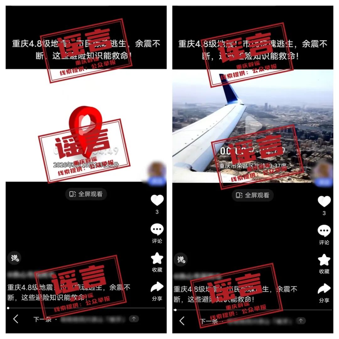 近日,有网民在互联网平台发布信息称“3月16日重庆荣昌区发生4.8级地震,市民惊魂逃生”,引发关注,经核实,网传信息系谣言。
