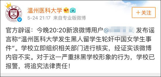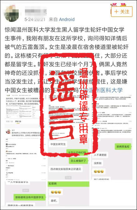 5月24日晚,新浪微博用户@归**义发布了一条“耸人听闻”的消息,内容称,惊闻温州医科大学黑人留学生轮奸中国女学生,女生是凌晨在宿舍楼道被轮奸的,而且发生了半个月,俩个黑人还没抓住……该用户还声称自己有朋友在这学校,以增加可信度。