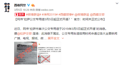 近日,网传“拉萨市首次公交专用道于2019年3月5日起正式开通”的消息。据@拉萨交警 澄清:此消息不属实,公交专用车道启用时间会通过各大主要新闻广播、电视、报纸、微信公众号等媒体进行公布。