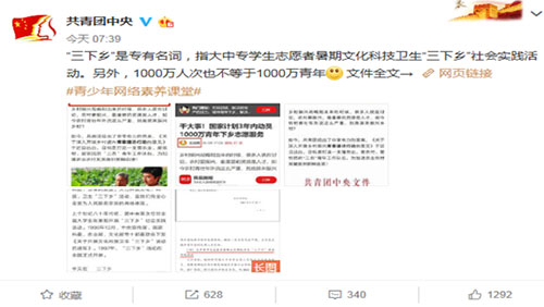 “国家计划3年内动员1000多万青年下乡”的消息在网上传播,4月11日,共青团中央官方辟谣。