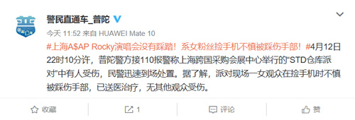 针对网传歌手A$AP Rocky上海演唱会发生踩踏事件,上海市公安局普陀分局今天(13日)中午通过官方微博辟谣称,派对现场一女观众在捡手机时不慎被踩伤手部,已送医治疗。