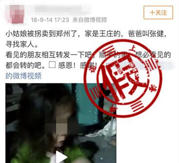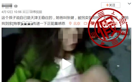 近日,一段“被拐女孩急寻家人”的视频在微博及朋友圈中被大量转发。视频中有一个穿绿色上衣的小女孩,浑身是伤,坐在地上。视频的介绍文字称“这个孩子说自已是天津王稳庄的,她爸叫张健,被拐卖到郑州,转发帮她找到家,传递一下正能量”。