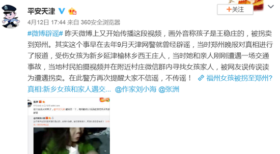 4月12日晚,天津市公安局“@平安天津”通过官方微博表示,视频中的受伤女孩为河南新乡延津榆林乡西王庄人,视频里她和亲人遭遇了一场交通事故,却被网友误传误读为遭遇拐卖,警方在此提醒大家不信谣、不传谣。