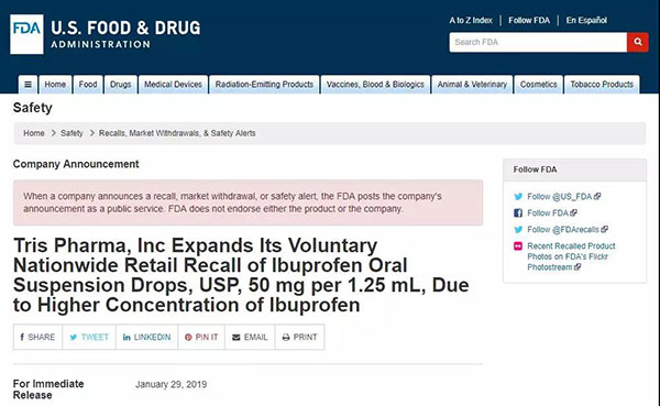 查阅了美国食药监局,发现2019年1月29日,确实有一条召回布洛芬的公告。