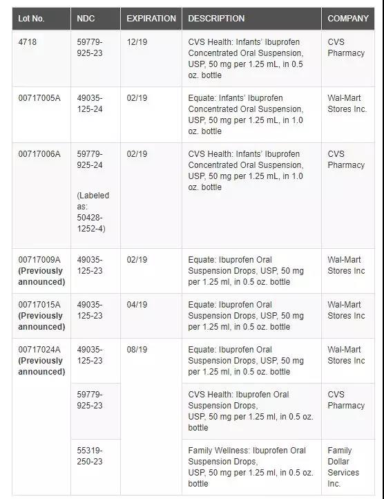 被召回批次的布洛芬产品(图片来源:美国食药监局官网)