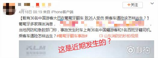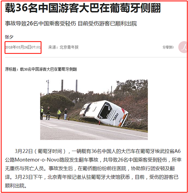 综上,所谓“近日36名中国游客大巴在葡萄牙翻车26人受伤”的消息纯属张冠李戴。(宋慧)