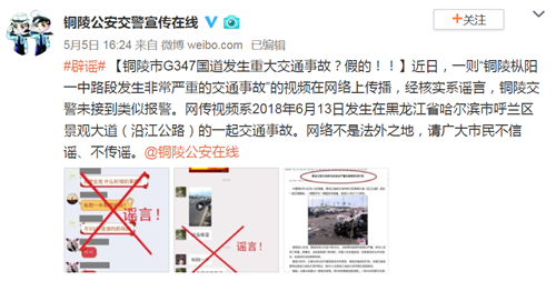 5月5日,安徽省铜陵市公安局交警支队“@铜陵公安交警宣传在线”通过官方微博辟谣,称“铜陵市G347国道发生非常严重的交通事故”视频近日在网络上传播,经核实该信息系谣言,铜陵交警未接到类似报警。