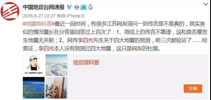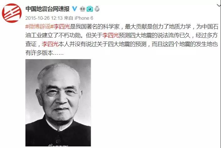 近几年,“新中国初期,李四光预测中国60年内将有4次特大地震……”这款谣言流传甚广,而其中的四个地震地点,网上已有N个版本。对此,中国地震局发言人早在几年前就明确表示:李四光部长生前没有这样的预言,纯属谣传。国家地震台网官方微博也不止一次针对此谣言进行了辟谣。