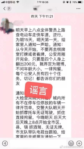 近日,微信群、朋友圈传播着一则很长的消息,内容包括:“明天早上八点全体警员上路查电动车走快车道,逆行,为期15天......”