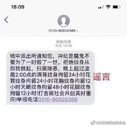 5月14日,江苏网警辟谣:公安机关不会简单地以纹身来认定,一个人是否是违法犯罪分子。因为,纹身的不一定是社会人,社会人不是都有纹身,希望广大网友不造谣、不信谣、不传谣,对于恶意造谣扰乱公共秩序的,公安机关将依法处理!