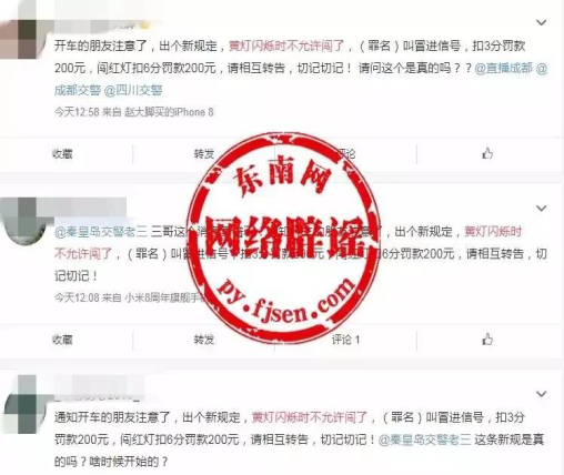 典型谣言版本3:通知开车的朋友注意了,出了新规定,黄灯闪烁时,不允许闯了,叫冒进信号