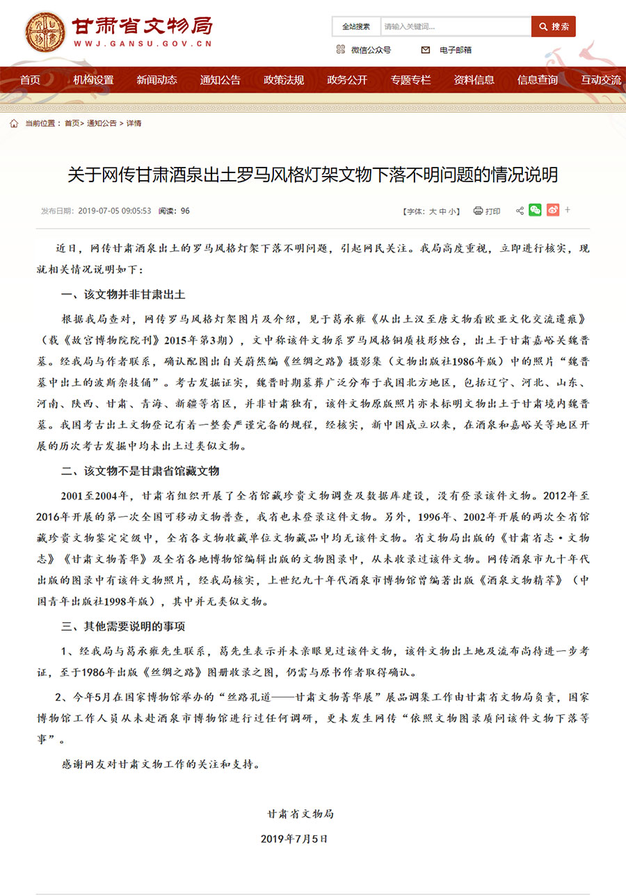 近日,网传甘肃酒泉出土的罗马风格灯架下落不明问题,引起网民关注。我局高度重视,立即进行核实,现就相关情况说明如下: