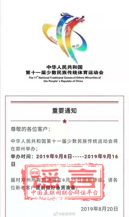 近日,一则郑州快递停运的通知在网络上广为流传,这则通知表明,因第十一届全国少数民族传统体育运动会举行,物流行业将在8月25日左右陆续停运,所有快递将会进入停业状态。对此,记者向郑州市公安局进行了求证,证实郑州快递停运实乃谣言,第十一届全国少数民族传统体育运动会期间,会对快递收寄物品加强安保排查。