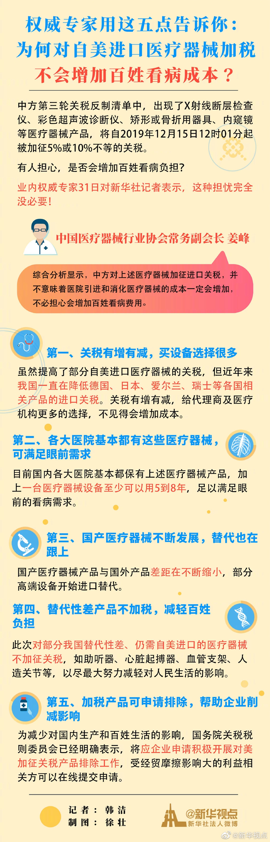 对此,中国医疗器械行业协会常务副会长姜峰31日接受记者采访时说,综合分析显示,中方对上述医疗器械加征进口关税,并不意味着医院引进和消化医疗器械的成本一定会增加,不必担心会增加百姓看病费用。
