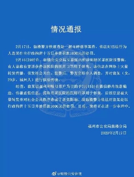 通报指出:翁某以盈利和吸引客户为目的,谎称有某医院的医用口罩用于售卖。