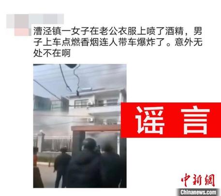 2月19日晚,网上流传一段火灾现场视频,并有谣言称起火原因系金山漕泾一女子在老公衣服上喷了酒精,男子上车点燃香烟连人带车爆炸。