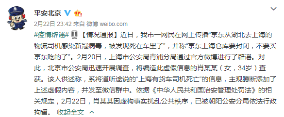真相:北京市公安局发布通报称,网民肖某某道听途说“上海有货车司机死亡”的消息,编造了“从湖北去上海的物流司机感染新型冠状病毒死亡”的谣言,现已被依法行政拘留。