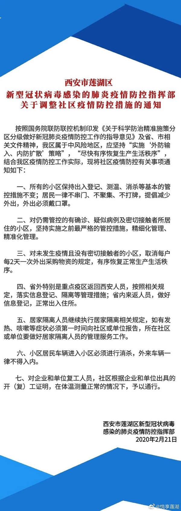 莲湖区以2月21日发布的《西安市莲湖区新型冠状病毒感染的肺炎疫情防控指挥部关于调整社区疫情防控措施的通知》政策为准。