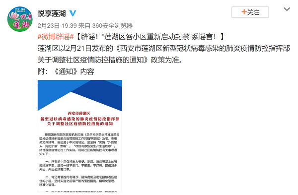 2月23日,中共西安市莲湖区委宣传部官方微博@悦享莲湖 辟谣称,“莲湖区各小区重新启动封禁”系谣言!