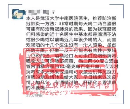 近期,一条来自“武汉大学中南医院医生乔主任笔记”的消息在网上流传,“喝酒可以防治新冠肺炎”又冒了出来,你可能已经猜到,事情并没有那么简单。