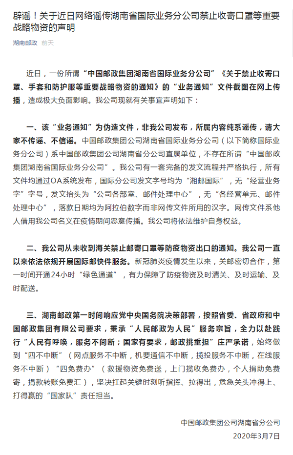 近日,一份所谓“中国邮政集团湖南省国际业务分公司”《关于禁止收寄口罩、手套和防护服等重要战略物资的通知》文件截图在网络传播。7日,中国邮政集团公司湖南省分公司在其官方微信发布辟谣声明表示,网传“业务通知”为伪造文件,所属内容纯系谣传。