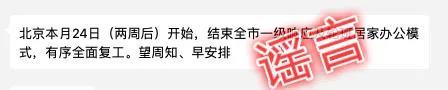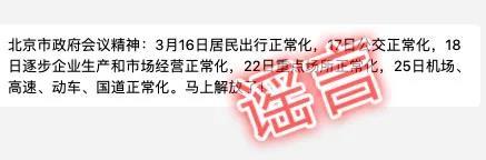 近日,两条谣言在多个微信群和朋友圈流传。一条声称“北京市政府会议精神,3月16日居民出行正常化,17日公交正常化……”,还有一条称“北京本月24日开始,结束全市一级响应及轮班居家办公模式,有序全面复工……”