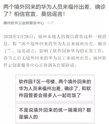 对此,福州软件园产业服务有限公司发布辟谣,春节之后无境外回来的华为员工来福州出差。
