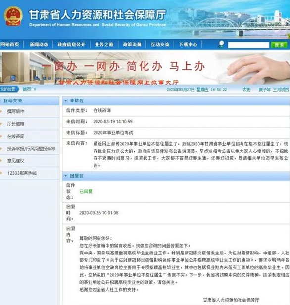 近期,网上流传“2020年事业单位不招往届生了”。对此,甘肃省人社厅近日作出回应: