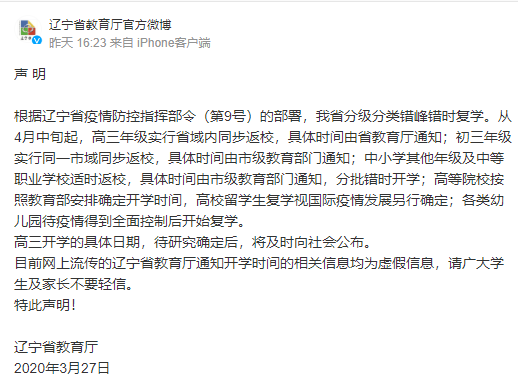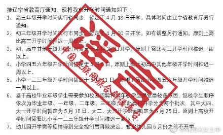 目前网上流传的辽宁省教育厅通知开学时间的相关信息均为虚假信息,请广大学生及家长不要轻信。