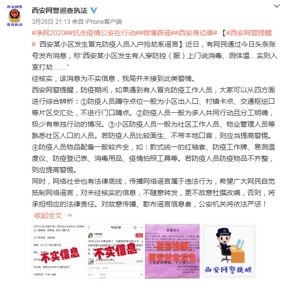近日,有网民发布消息称,“西安某小区发生有人穿防控(服)上门说消毒、测体温…实则入室打劫……”