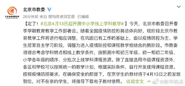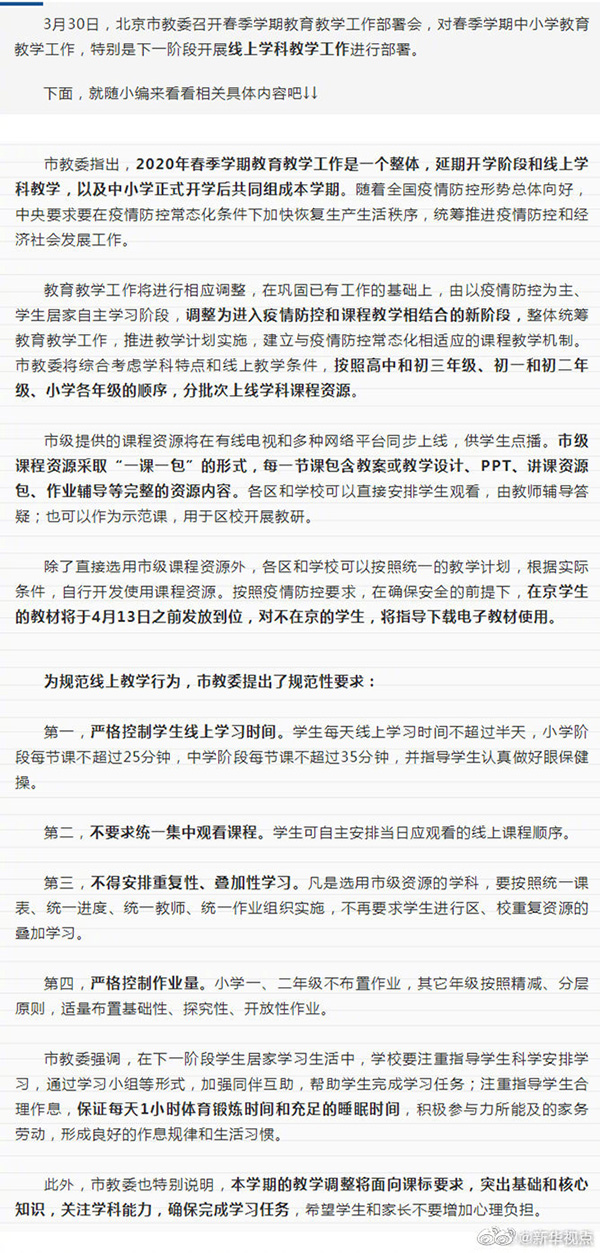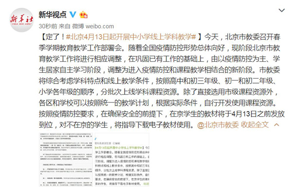 3月30日,北京市教委召开春季学期教育教学工作部署会。随着全国疫情防控形势总体向好,现阶段北京市教育教学工作将进行相应调整,在巩固已有工作的基础上,由以疫情防控为主、学生居家自主学习阶段,调整为进入疫情防控和课程教学相结合的新阶段。市教委将综合考虑学科特点和线上教学条件,按照高中和初三年级、初一和初二年级、小学各年级的顺序,分批次上线学科课程资源。除了直接选用市级课程资源外,各区和学校可以按照统一的教学计划,根据实际条件,自行开发使用课程资源。按照疫情防控要求,在确保安全的前提下,在京学生的教材将于4月13日之前发放到位,对不在京的学生,将指导下载电子教材使用。
