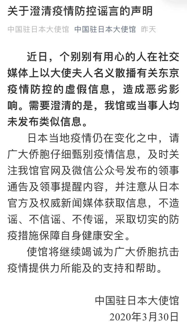 近日,网络上流传着一则以中国驻日大使夫人名义发出东京即将封城的消息。3月30日下午,中国驻日大使馆发布《关于澄清疫情防控谣言的声明》:近日,个别别有用心的人在社交媒体上以大使夫人名义散播有关东京疫情防控的虚假信息,造成恶劣影响。需要澄清的是,我馆或当事人均未发布类似信息。