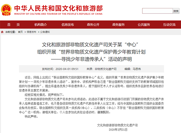 文化和旅游部非物质文化遗产司未参与此项活动,此活动不属于文化和旅游行政部门开展的非物质文化遗产传承人培养或者遴选工作,也不是各级非物质文化遗产代表性传承人认定工作。经与中国联合国教科文组织全国委员会秘书处核实,联合国教科文组织及其一类机构(中心)、二类机构(中心)不存在“联合国教科文组织国际教育中心”这一机构。请相关单位、个人在参加此类社会活动时,谨慎甄别。