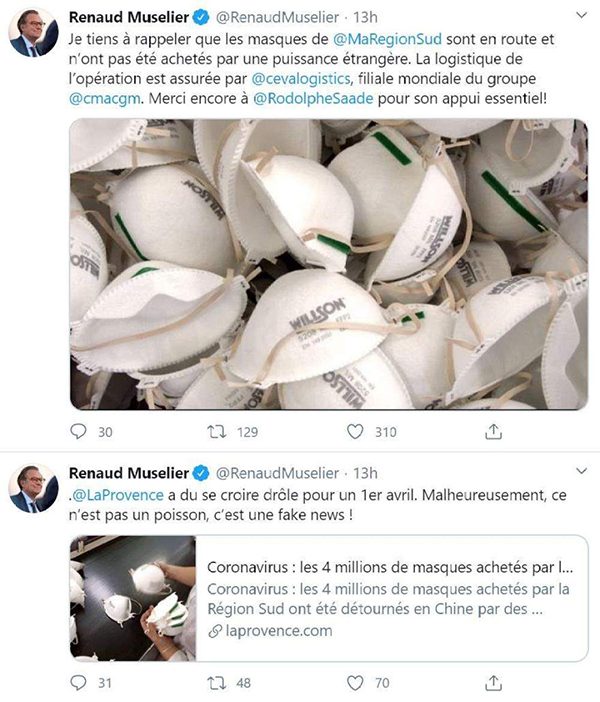 4月1日,法国普阿蓝大区主席雷诺·米瑟利耶在同法国多家媒体视频连线时宣称,美国人在中国机场停机坪上以3倍价格用现金将该大区订购的数百万口罩抢购,原本飞往法国的航班直接改飞美国。该言论得到广泛报道,一些法国民众因此抨击中国“见利忘义”。