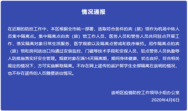 不存在网上谣传的返沪留学生全部隔离在崇明的情况,也不存在谣传的人员随便进出情况。