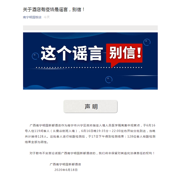 今日凌晨,广西南宁明园新都酒店发布声明,对6月16日晚,一则“南宁明园新都酒店前段时间接待北京来的人,有20几人发烧,被集体隔离”的传言进行辟谣:广西南宁明园新都酒店作为南宁市兴宁区政府指定入境人员医学隔离集中观察点,于6月16日入住119间客人(从曼谷航班入境),6月16日19:35分~22:00左右开始分批到达,当晚共计接待128人。这批客人进行核酸检测后,于17日下午得到检测结果:128位客人核酸检测结果全部为阴性。