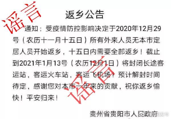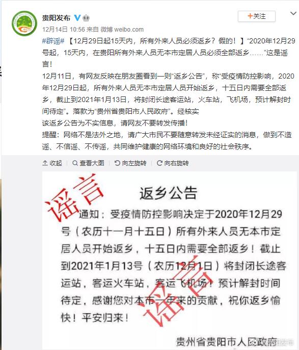 “2020年12月29号起,15天内,在贵阳所有外来人员无本市定居人员必须全部返乡……”这是谣言!