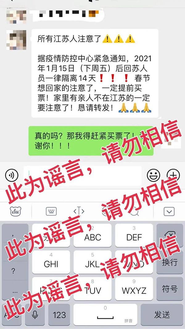 临近春运,疫情防控形势日益严峻,与返乡回程相关的谣言开始出现。日前,就有一条关于来苏返苏人员入苏隔离的信息在微信等社交媒体上传播开来。