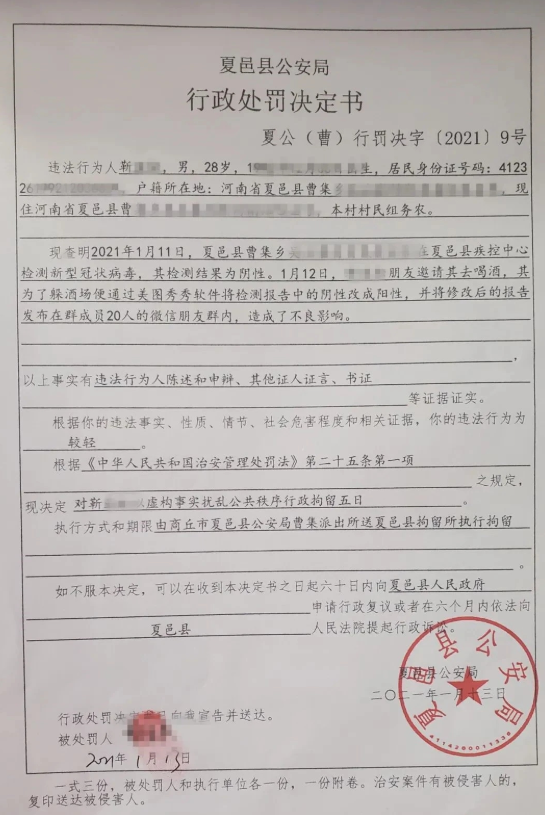 经查,2021年1月11日,夏邑县曹集乡村民靳某在夏邑县疾控中心检测新型冠状病毒,其检测结果为阴性,1月12日,靳某朋友邀请其去喝酒,其为了躲酒场通过美图秀秀软件将检测报告中的阴性改成阳性,并将修改后的报告发布在群成员20人的微信朋友群内,造成了不良影响。