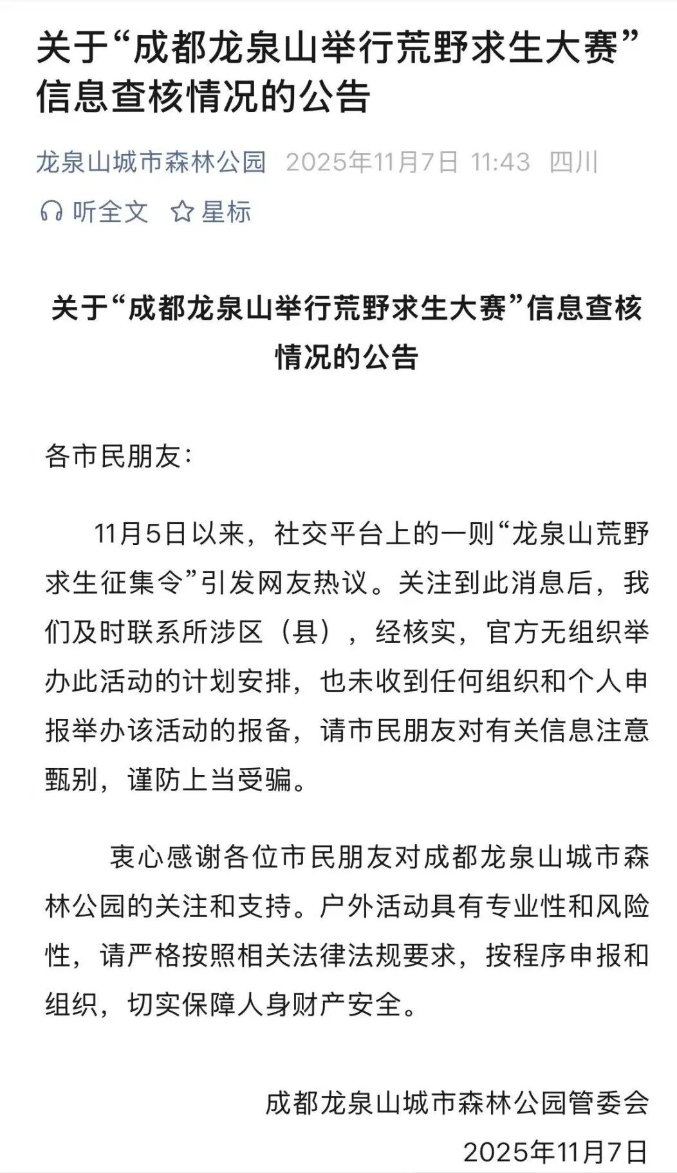 11月5日,有网民在社交平台发布“成都龙泉荒野求生大赛征集令”,称将在龙泉山举办荒野求生赛事,并面向社会征集赛事策划、规则和筹备方案。相关帖文引发一定关注,不少网民表达参赛意愿,询问报名方式、发起组队邀约等。