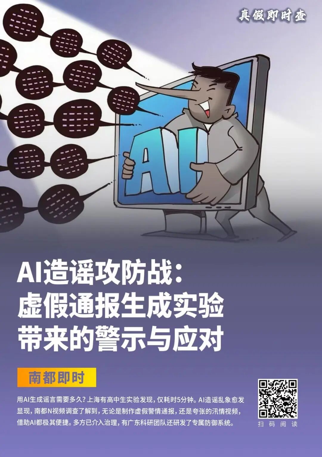 “深度调查”栏目聚焦行业乱象,推出系列重磅调查。近年来,利用AI造谣的乱象愈发猖獗,南都N视频起底“网络神医”制造链条、以AI造假起号引流灰色产业链;聚焦AI造谣攻防战,实测揭露“AI写作神器”“视频生成器”在网上泛滥,只需输入简单指令,涉及汛情、火灾等敏感主题的虚假文案瞬间生成,还能炮制“正式警情通报”。
