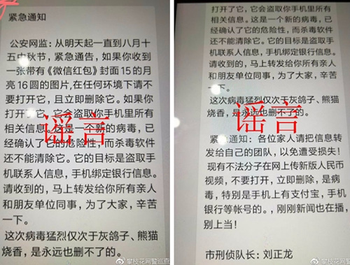 9月20日,近日,攀枝花网警巡查执法官方微博发布通报:近日,攀枝花网警在工作巡查中发现,有网民在微信群朋友圈传播一则“市刑侦队长”发送的“紧急通知”,内容为“公安网监:从明天起一直到八月十五中秋节,紧急通告,如果你收到一张带有《微信红包》封面15的月亮16圆的图片,在任何环境下请不要打开它,且立即删除它。如果你打开了它,会被盗取你手机里所有相关信息。这是一个新的病毒,已经确认了它的危险性,而杀毒软件还不能清除它。它的目标是盗取手机联系人信息,手机绑定银行信息。请收到的,马上转发给你所有亲人和朋友单位同事。这条消息还称,有不法分子在网上传新版人民币视频,这也是病毒,请立即删除。”