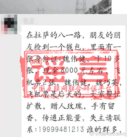 西藏网警提示:大家在转发寻人、寻物等信息前,首先,要进行确认甄别,以免帮助虚假信息传播,成为不法分子的帮凶。其次,此类虚假信息中的号码很可能会是吸费电话或诈骗电话,请不要轻信拨打!若在生活中真的捡到了钱包及他人身份证件等贵重物品,可以将物品交至就近的警务站、派出所或巡逻的民警,民警会尽快通知失主。最后,对于此类未经核实的消息请大家不要随意转发,自觉做到不造谣、不传谣、不信谣!